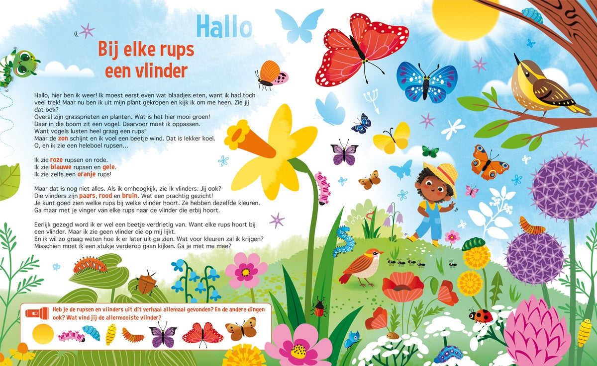 Ga samen met rupsje Poppy op avontuur! In dit vrolijke zoek- en (voor)leesboek ontdek je hoe een klein rupsje verandert in een prachtige vlinder. Poppy is nieuwsgierig en wil alles weten over de wereld om haar heen. Help jij haar mee speuren naar het antwoord op haar grote vraag: hoe ziet een vlinder eruit? Met de stevige kartonnen “zaklamp” die bij het boek hoort, kun je zelf op ontdekkingstocht. Schuif de zaklamp achter de pagina’s en zie allerlei verborgen verrassingen verschijnen! Een magische leeservaring die jonge speurneuzen blijft boeien. Dit prachtig geïllustreerde boek combineert spel en educatie: kinderen leren over de metamorfose van rups tot vlinder en worden gestimuleerd om te kijken, zoeken en ontdekken. Perfect voor nieuwsgierige peuters en kleuters vanaf 3 jaar. Een spannend en leerzaam avontuur dat ouders en kinderen samen kunnen beleven. Ideaal als cadeau en gegarandeerd goed voor uren speel- en leesplezier! Bekijk je ook de andere titels in deze serie?